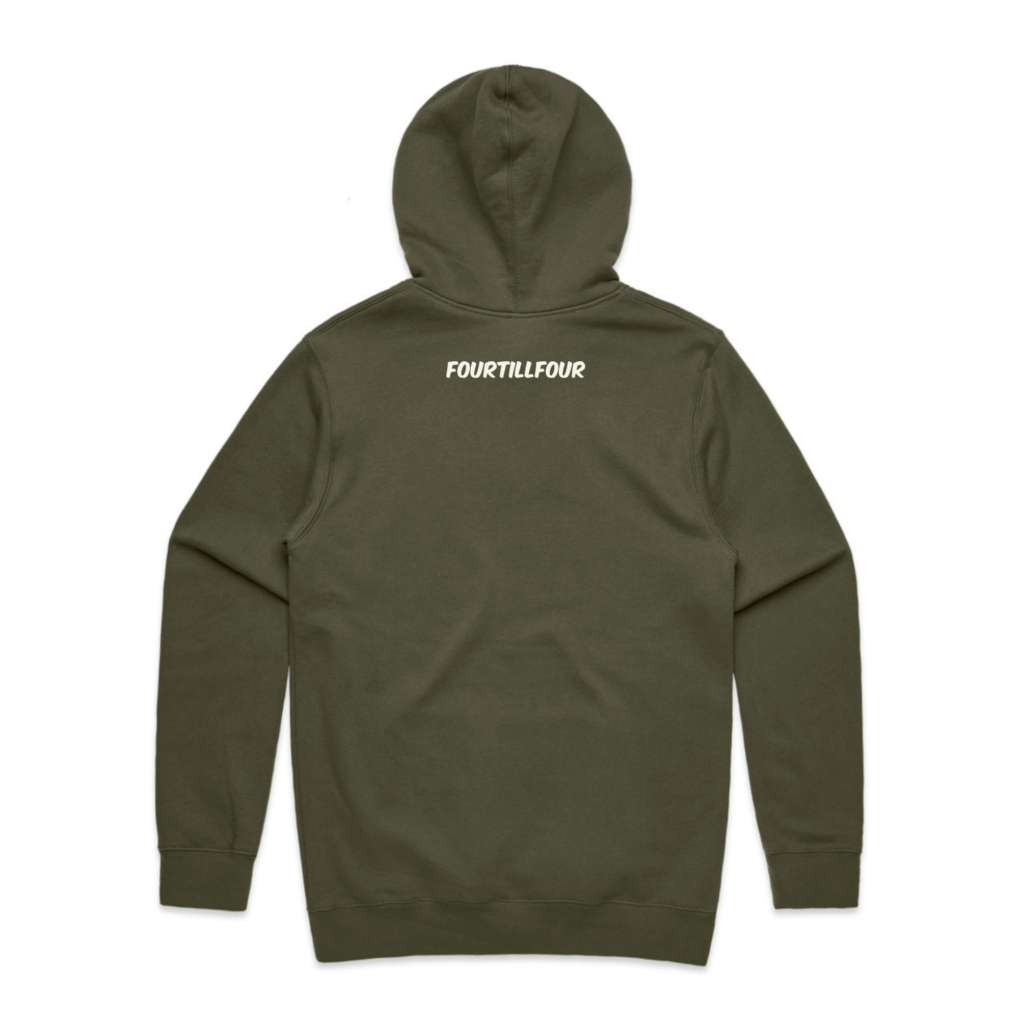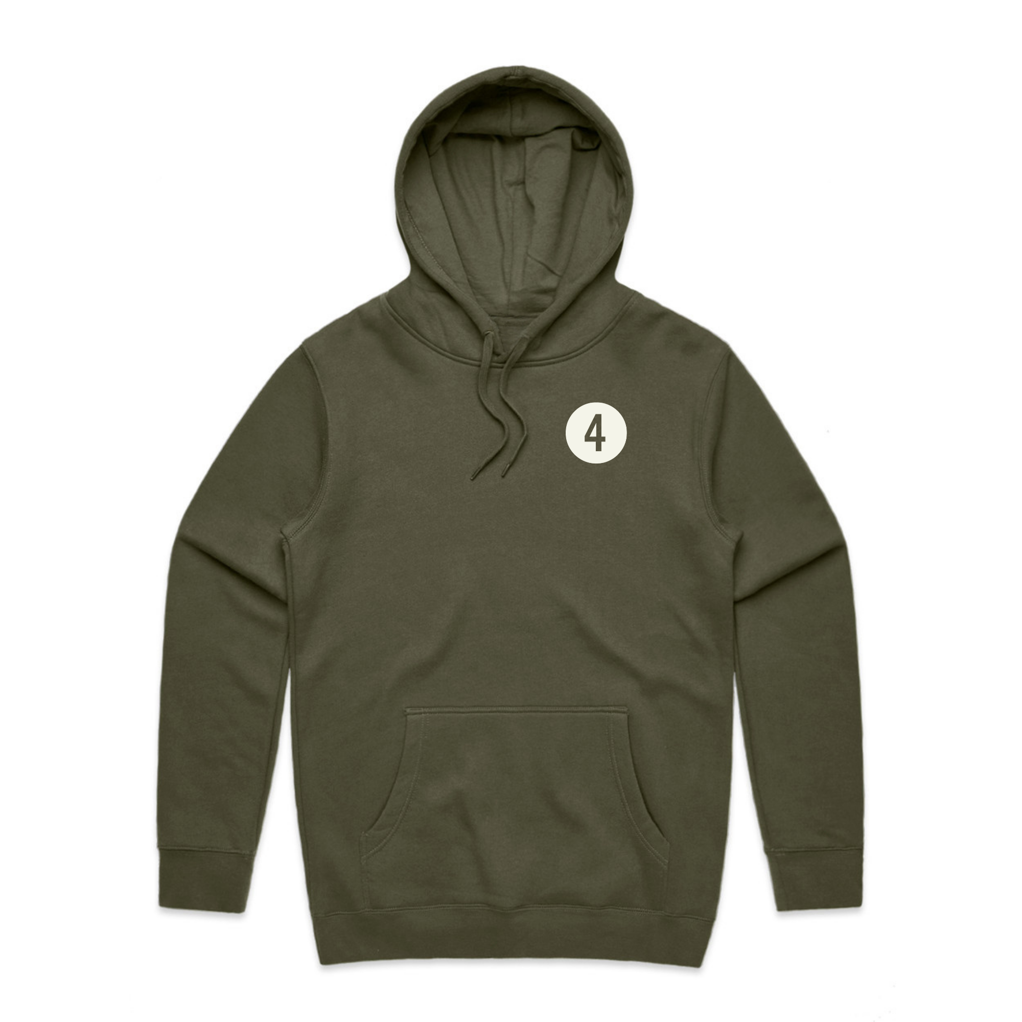 The 4 Circle Hooded Sweatshirt, available in army green with a white print.