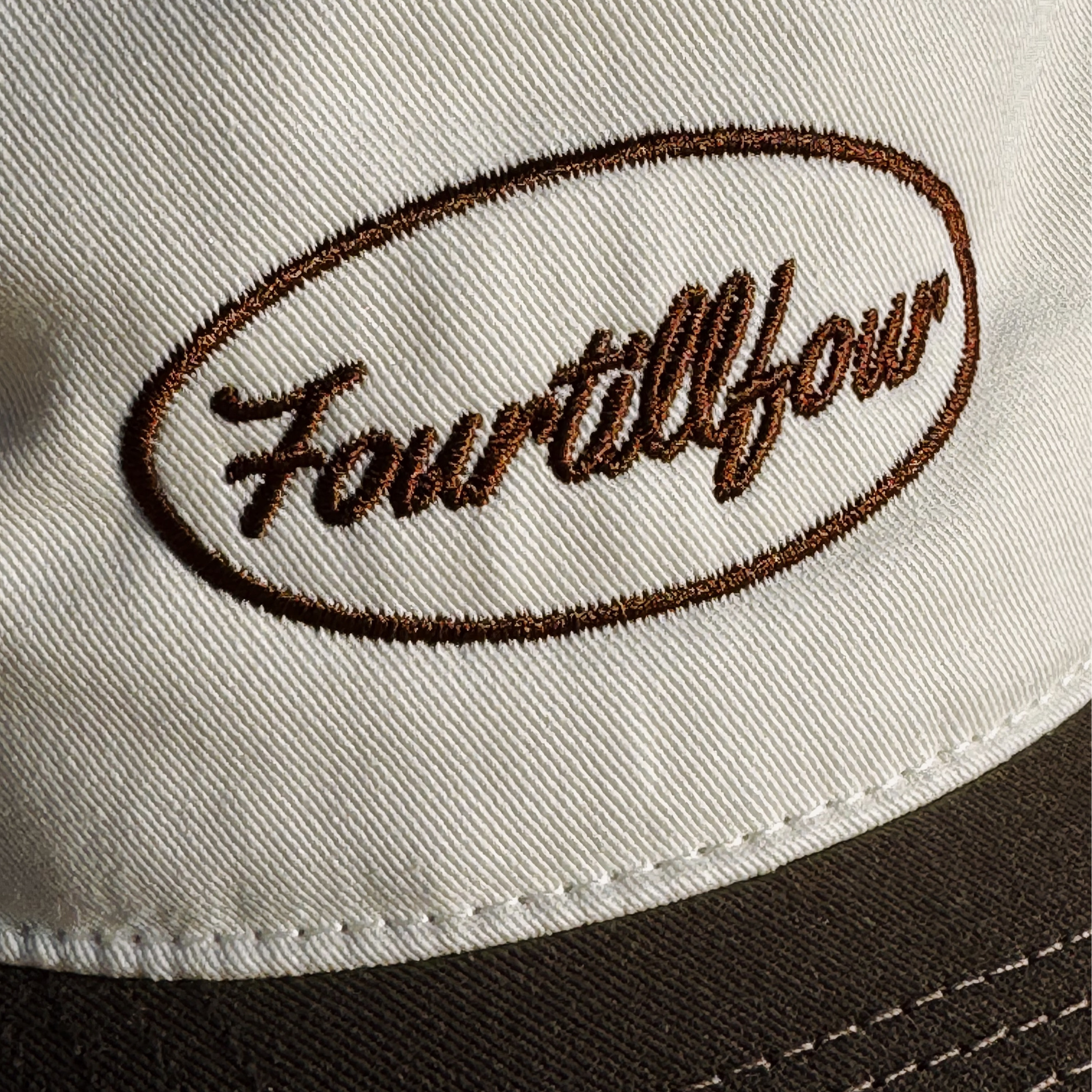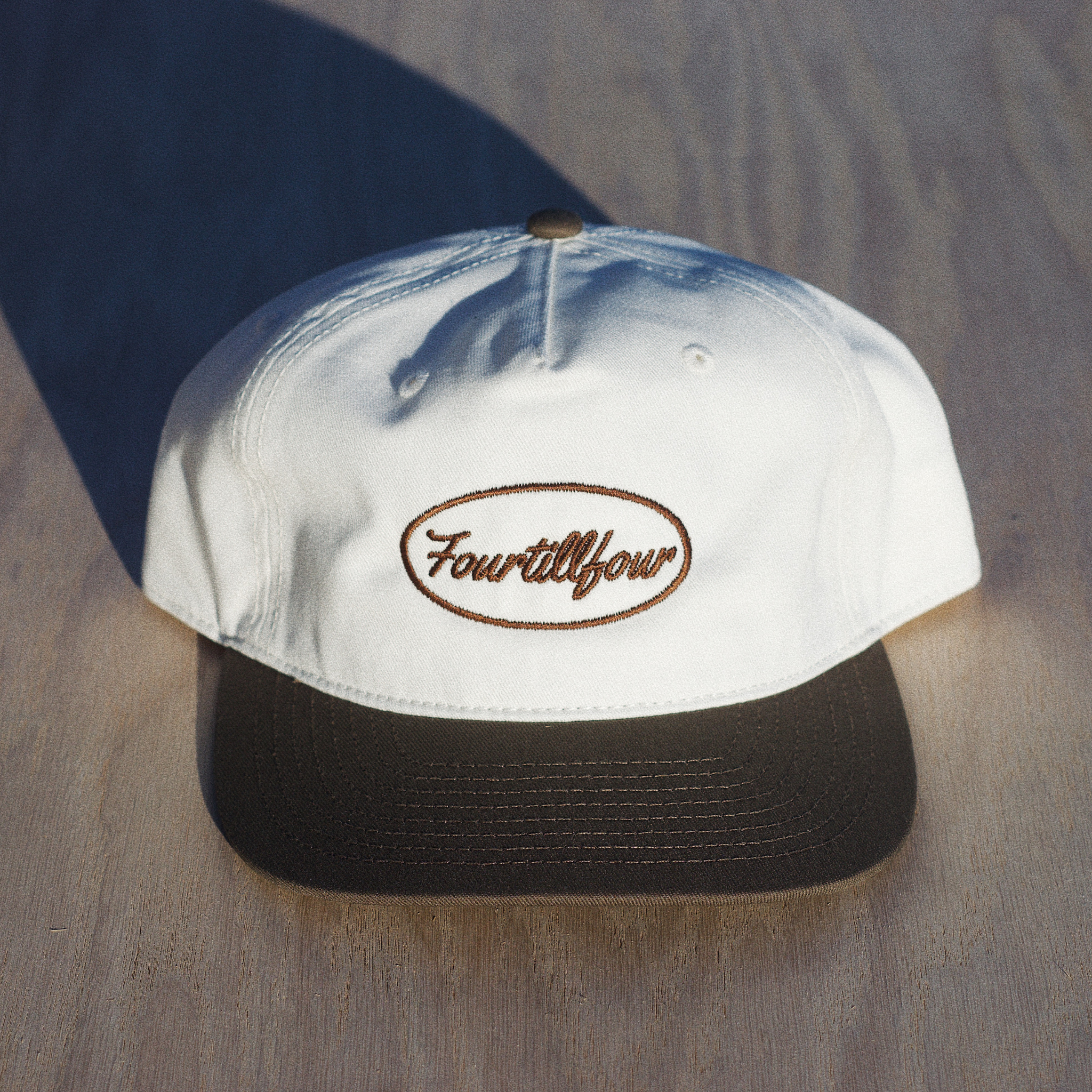 The FTF Script Hat available in white & walnut two-tone with walnut embroidery